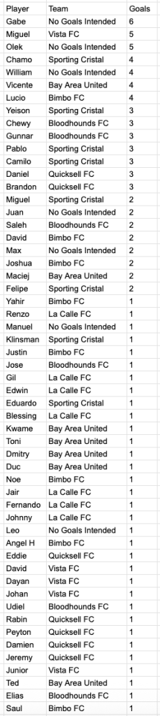 - No Goals Intended: Gabe (2), Olek (1), William (1), Max (1)